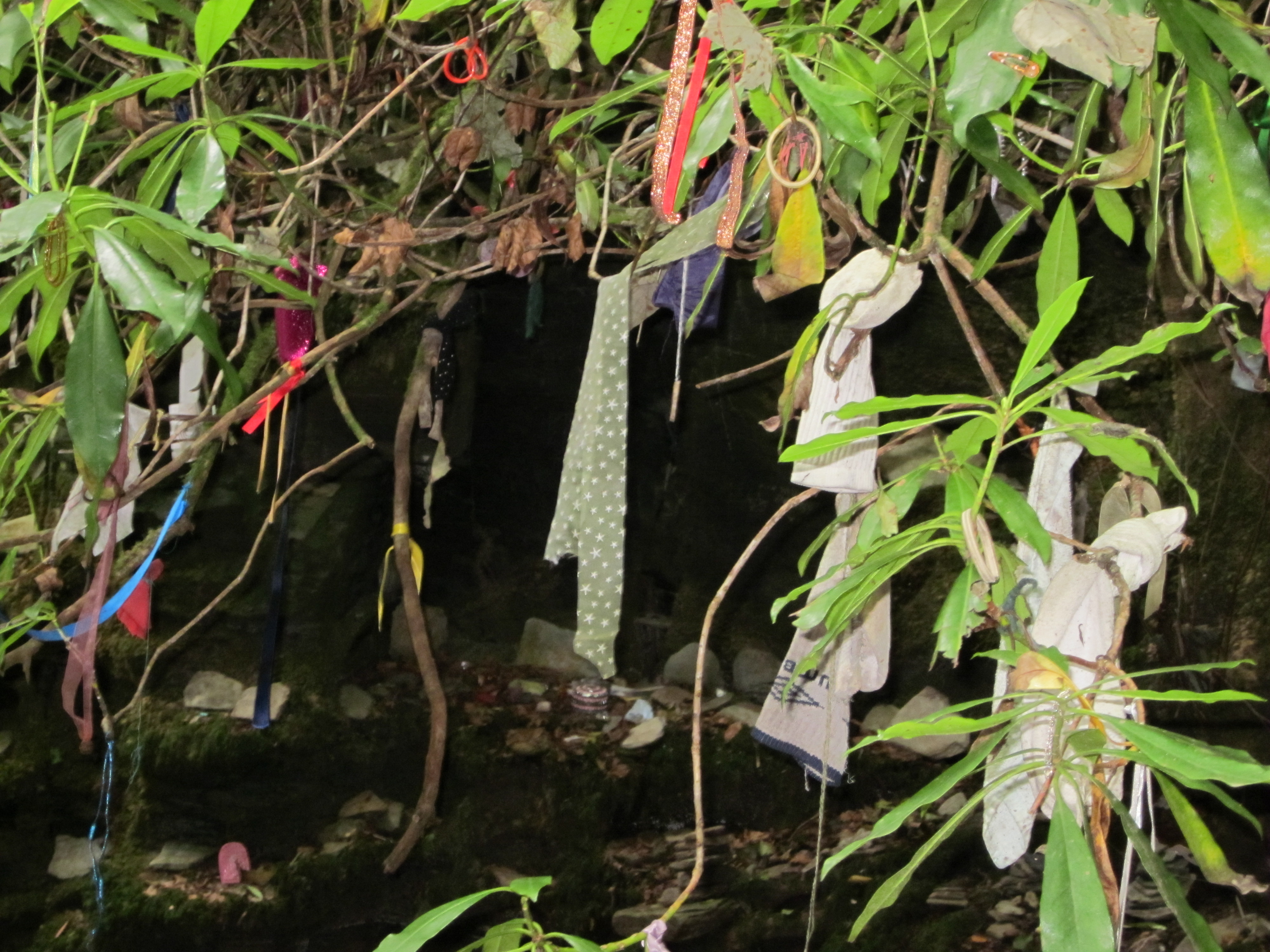 The stone walls were of slate, forming natural shelves that were covered in small candles and other offerings; on the larger shelves, especially in the middle of the stream; were stones in tall pillars, one on top of the other. The trees were covered in colourful ribbons and other offerings, with one having coins pressed into its bark.